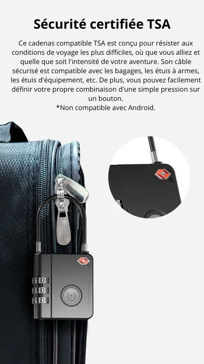Oui, ce cadenas est compatible TSA, ce qui signifie que les agents de sécurité aéroportuaire peuvent l’ouvrir sans l’endommager lors des contrôles. Il est conçu pour résister aux conditions de voyage les plus extrêmes . Son câble sécurisé s’adapte à différents types d’équipements : valises, sacs de sport, étuis à armes ou à matériel. De plus, tu peux définir ta propre combinaison en un clic, pour une sécurité renforcée et un usage simple.
