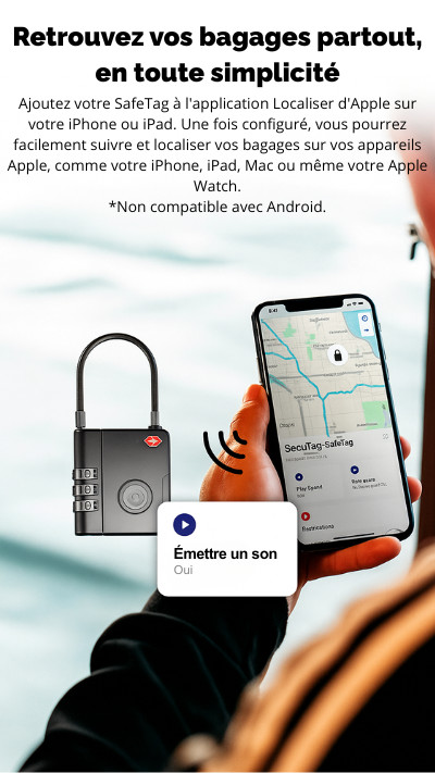 Le cadenas se connecte directement à l’application Localiser d’Apple grâce à la technologie Bluetooth et réseau Find My. Il permet de sécuriser ton bagage et de le localiser en temps réel via ton iPhone, iPad ou Apple Watch.